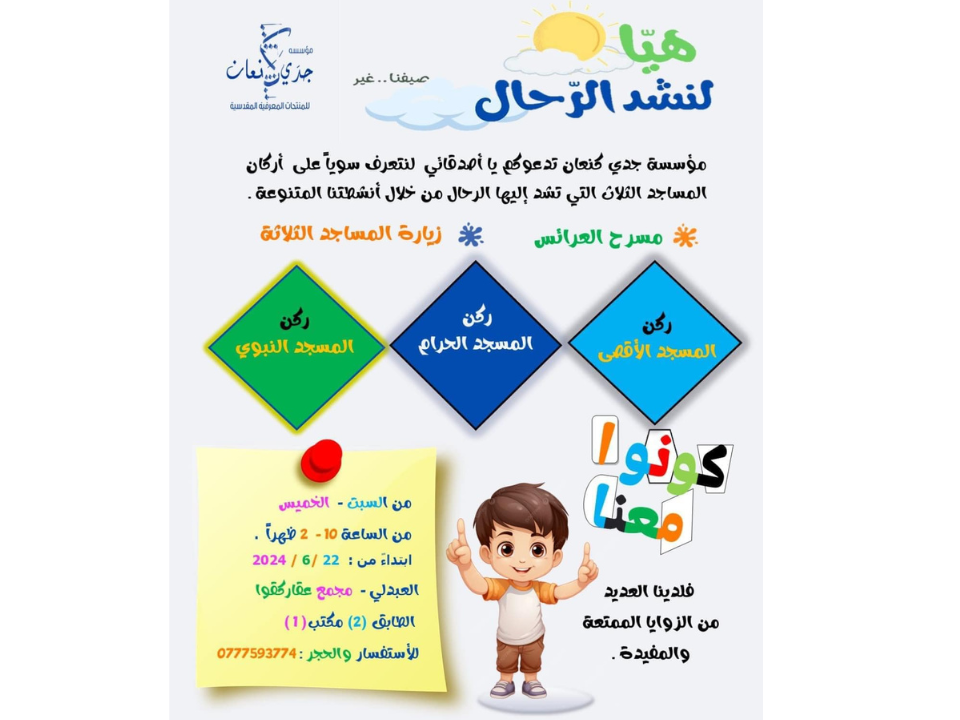 مع جدي كنعان، نوفر بيئة تعليمية مبتكرة لأطفال 4-18 سنة، حيث تلتقي الجودة بالإبداع وتستحضر مقدساتنا في كل أداة.